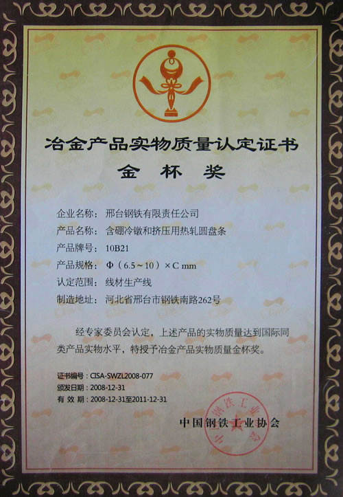 含硼冷鐓和冷擠壓用鋼盤(pán)條獲冶金產(chǎn)品實(shí)物質(zhì)量金杯獎(jiǎng)