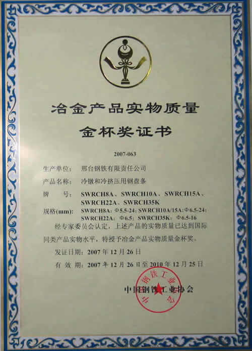 冷鐓和冷擠壓用鋼盤(pán)條SWRCH18A...SWRCH35K獲冶金產(chǎn)品實(shí)物質(zhì)量金杯獎(jiǎng)