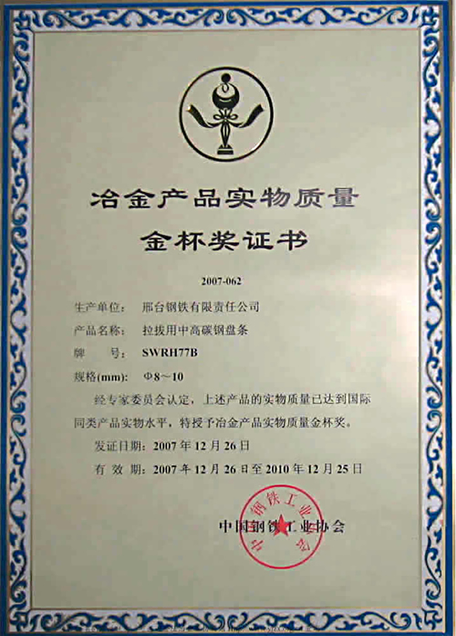 拉撥用中高碳鋼盤條SWRH77B獲冶金產(chǎn)品實物質(zhì)量金杯獎