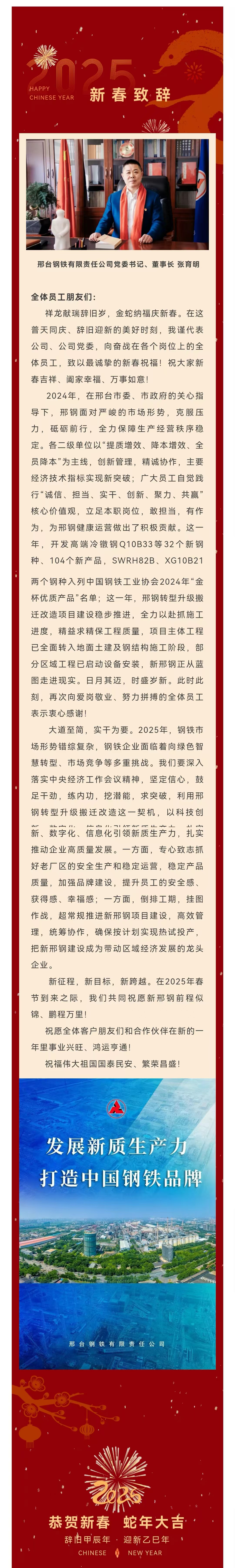 祥龍獻(xiàn)瑞辭舊歲,金蛇納福慶新春。在這普天同慶、辭舊迎新的美好時(shí)刻,我謹(jǐn)代表公司、公司黨委,向奮戰(zhàn)在各個(gè)崗位上的全體員工,致以最誠(chéng)摯的新春祝福!祝大家新春吉祥、闔家幸福、萬(wàn)事如意!