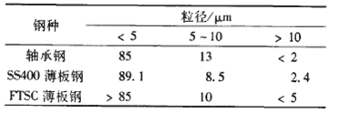 通常認(rèn)為鋼中粒徑在1-50μm的非金屬夾雜物都屬于顯微夾雜物。對(duì)于高品質(zhì)特殊用途鋼種,鋼中粒徑小于10μm的顯微夾雜物占有非常大的比例。表l為國(guó)內(nèi)幾種特殊鋼中顯微夾雜物的粒徑分布?! ?/p>