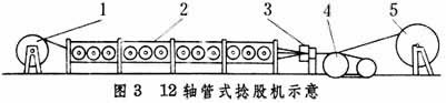卷線:將鋼絲線盤(pán),重新卷在捻股機(jī)的工字輪上;也可將鋼絲從拔絲機(jī)后直接卷到工字輪上;捻股:將鋼絲捻成繩股。捻股機(jī)有筐籃式、軸管式、無(wú)管式和雙捻機(jī)等。圖3為12軸管式捻股機(jī)示意圖,1是裝下層繩股的工字輪,2是旋轉(zhuǎn)的機(jī)筒,內(nèi)裝12個(gè)卷滿(mǎn)鋼絲的工字輪,3是成股的壓線瓦,4是牽引輪,5是上層繩股的收線輪,機(jī)筒旋轉(zhuǎn)一周,牽引輪引出的繩股長(zhǎng)度即為股的捻距。