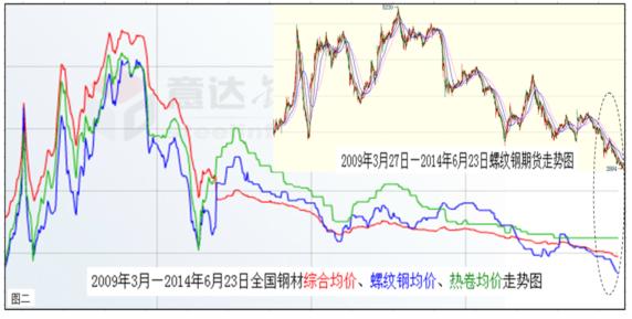 底線的提高,勢(shì)必助推中國(guó)經(jīng)濟(jì)大勢(shì)呈現(xiàn)前低后高的走勢(shì)。而經(jīng)過(guò)長(zhǎng)期低迷的中國(guó)鋼材市場(chǎng),也已經(jīng)具備逐漸走強(qiáng)的兩大要素:一是鋼市走強(qiáng)的外在環(huán)境趨好(見(jiàn)上圖一)。包括上半年推出一系列微刺激效應(yīng)逐漸顯現(xiàn),下半年由于經(jīng)濟(jì)增長(zhǎng)底線提高,以及持續(xù)加推的動(dòng)力措施等合成發(fā)酵,定會(huì)形成遠(yuǎn)比上半年良好的鋼市發(fā)展環(huán)境;二是鋼市走強(qiáng)的內(nèi)在動(dòng)能充沛(下圖二)。鋼材價(jià)格經(jīng)過(guò)長(zhǎng)期下跌后,已經(jīng)下穿了所有的技術(shù)阻力位,使業(yè)內(nèi)根本無(wú)法從技術(shù)面進(jìn)行詮釋。但從價(jià)值規(guī)律、市場(chǎng)規(guī)律以及基本面情況看,目前鋼材價(jià)格的底部特征已經(jīng)十分明顯,空方量能也已近衰竭。因此,經(jīng)過(guò)短時(shí)間的整固蓄勢(shì)后,震蕩上揚(yáng)應(yīng)該是后期運(yùn)行的主基調(diào)。如果再結(jié)合宏觀上經(jīng)濟(jì)增長(zhǎng)底線的提高,下半年鋼材價(jià)格恢復(fù)性上揚(yáng)既在情理之中,也是勢(shì)所必然。所以,基于經(jīng)濟(jì)和鋼市大勢(shì)筆者作出,下半年全國(guó)鋼材價(jià)格勢(shì)必高于上半年的預(yù)測(cè)。