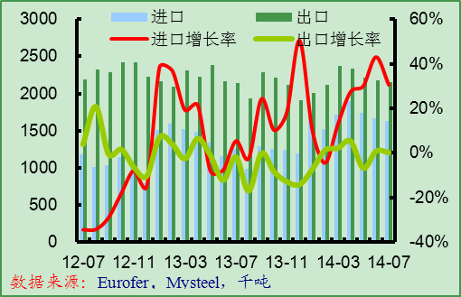 8月份歐洲粗鋼日均產(chǎn)量為48.9萬噸,環(huán)比下降7%,同比增長2.8%,需求季節(jié)性下降所致。9月份歐洲需求季節(jié)性復(fù)蘇,預(yù)計粗鋼日均產(chǎn)量將環(huán)比回升。7月份歐盟出口鋼材215萬噸,同比增長0.2%,進(jìn)口鋼材163萬噸,同比增長31%,凈出口量52萬噸,同比下降42%,環(huán)比持平。9月份歐元兌美元大幅貶值,歐洲鋼廠的進(jìn)口壓力明顯緩解,而出口競爭力得到加強,預(yù)計四季度歐洲鋼材凈出口量將環(huán)比大幅回升。