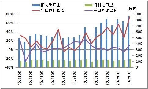 2014年9月我國出口鋼材852萬噸,創(chuàng)下歷史新高,同比大增73.2%。一方面,上年同期基數(shù)較低,導(dǎo)致9月鋼材出口同比增速上升明顯。另一方面,9月我國鋼材出口均價(jià)加速下跌,國際競爭優(yōu)勢明顯,進(jìn)一步刺激鋼材出口。當(dāng)月鋼材出口均價(jià)739美元/噸,環(huán)比下降4.9%,同比下降10.7%。