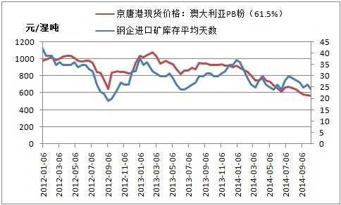 圖三:鋼企進(jìn)口礦庫存天數(shù)與京唐港澳粉價(jià)格走勢