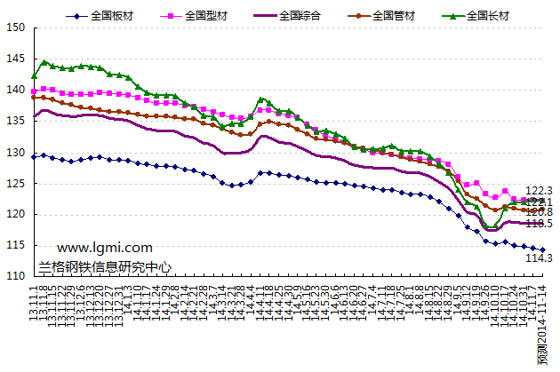 2014年第45周(2014.11.3-11.7)蘭格鋼鐵全國鋼材綜合價格指數(shù)達到118.5點,與上周持平,較去年同期下降13.24%。其中,LGMI長材價格指數(shù)為122.4點,較上周上升0.31%,較去年同期下降15.15%;LGMI型材價格指數(shù)為122.2點,較上周下降0.12%,較去年同期下降12.83%;LGMI板材價格指數(shù)為114.5點,較上周下降0.25%,較去年同期下降11.62%;LGMI管材價格指數(shù)為120.6點,較上周下降0.05%,較去年同期下降13.02%(詳見圖1)。
