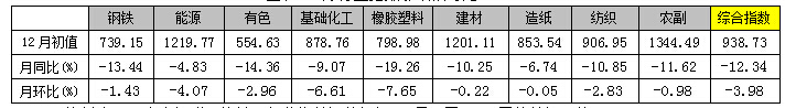 2014年12月份,上海鋼聯(lián)大宗商品價格指數(shù)(MyBCIC)初值為938.73,同比下跌了12.34%;環(huán)比下跌了3.98%,同環(huán)比跌幅繼上月均有所擴大。