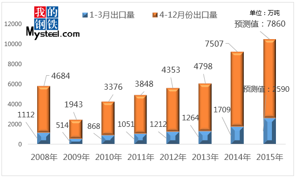 圖表:2008-2015年國內鋼材出口量情況及預測