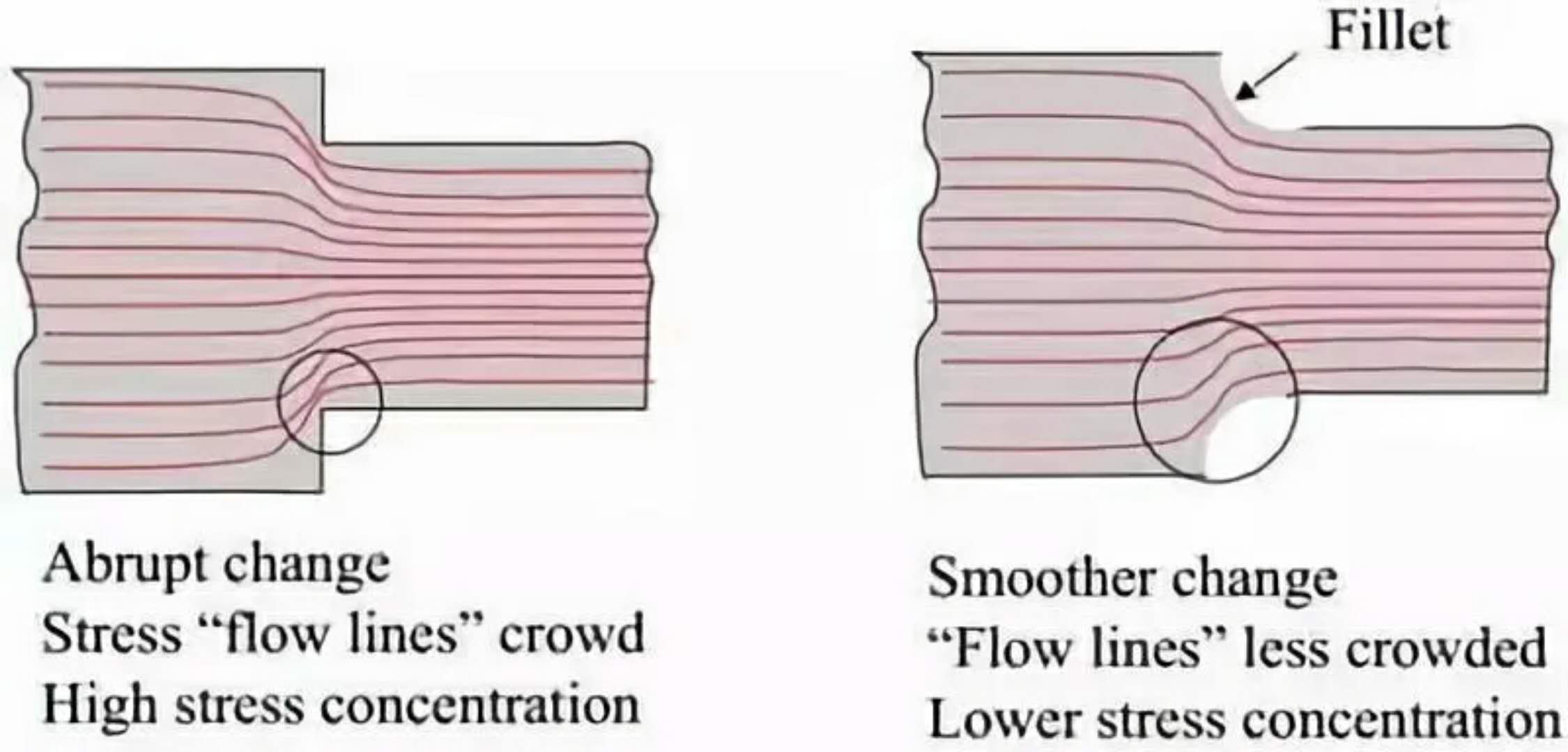 實(shí)際上,所有的疲勞失效都發(fā)生在應(yīng)力集中點(diǎn)或應(yīng)力集中處的零件的外表面上。例如,凹槽、圓角、孔、螺紋、鍵槽、花鍵、焊縫等。如果該部件提供長(zhǎng)期無(wú)故障的服務(wù),設(shè)計(jì)者必須考慮到這些應(yīng)力提升器的影響。應(yīng)力集中的作用直接與其半徑小有關(guān)。與先前提到的促進(jìn)疲勞失效的微裂紋一樣,應(yīng)力發(fā)生位置的半徑越小,產(chǎn)生的應(yīng)力越集中越大。有趣的是,應(yīng)力集中對(duì)高延展性的金屬影響很小。其解釋是,由幾何變化引起的應(yīng)力集中被限制在屈服應(yīng)力,止于塑性變形。