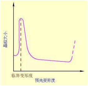 (2)預(yù)先變形度 變形度的影響主要與金屬變形的均勻度有關(guān)。變形越不均勻, 再結(jié)晶退火后的晶粒越大。變形度很小時,因不足以引起再結(jié)晶,晶粒不變。當(dāng)變形度達(dá)到2~10%時,金屬中少數(shù)晶粒變形,變形分布很不均勻,所以再結(jié)晶時生成的晶核少,晶粒大小相差極大,非常有利于晶粒發(fā)生吞并過程而很快長大,結(jié)果得到極粗大的晶粒。使晶粒發(fā)生異常長大的變形度稱作臨界變形度。生產(chǎn)上應(yīng)盡量避免在臨界變形度范圍內(nèi)的塑性變形加工。超過臨界變形度之后,隨變形度的增大,晶粒的變形更加強(qiáng)烈和均勻,再結(jié)晶核心越來越多,因此再結(jié)晶后的晶粒越來越細(xì)小。但是當(dāng)變形度過大(約≥90%)時, 晶??赡茉俅纬霈F(xiàn)異常長大,一般認(rèn)為它是由形變織構(gòu)造成的。