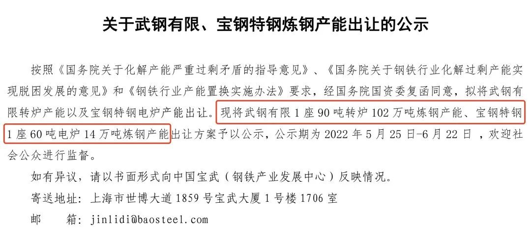 按照《國務(wù)院關(guān)于化解產(chǎn)能嚴(yán)重過剩矛盾的指導(dǎo)意見》、《國務(wù)院關(guān)于鋼鐵行業(yè)化解過剩產(chǎn)能實(shí)現(xiàn)脫困發(fā)展的意見》和《鋼鐵行業(yè)產(chǎn)能置換實(shí)施辦法》要求,經(jīng)國務(wù)院國資委復(fù)函同意,擬將武鋼有限轉(zhuǎn)爐產(chǎn)能以及寶鋼特鋼電爐產(chǎn)能出讓?,F(xiàn)將武鋼有限1座90噸轉(zhuǎn)爐102萬噸煉鋼產(chǎn)能、寶鋼特鋼1座60噸電爐14萬噸煉鋼產(chǎn)能出讓方案予以公示,公示期為2022年5月25日-6月22日,歡迎社會公眾進(jìn)行監(jiān)督。