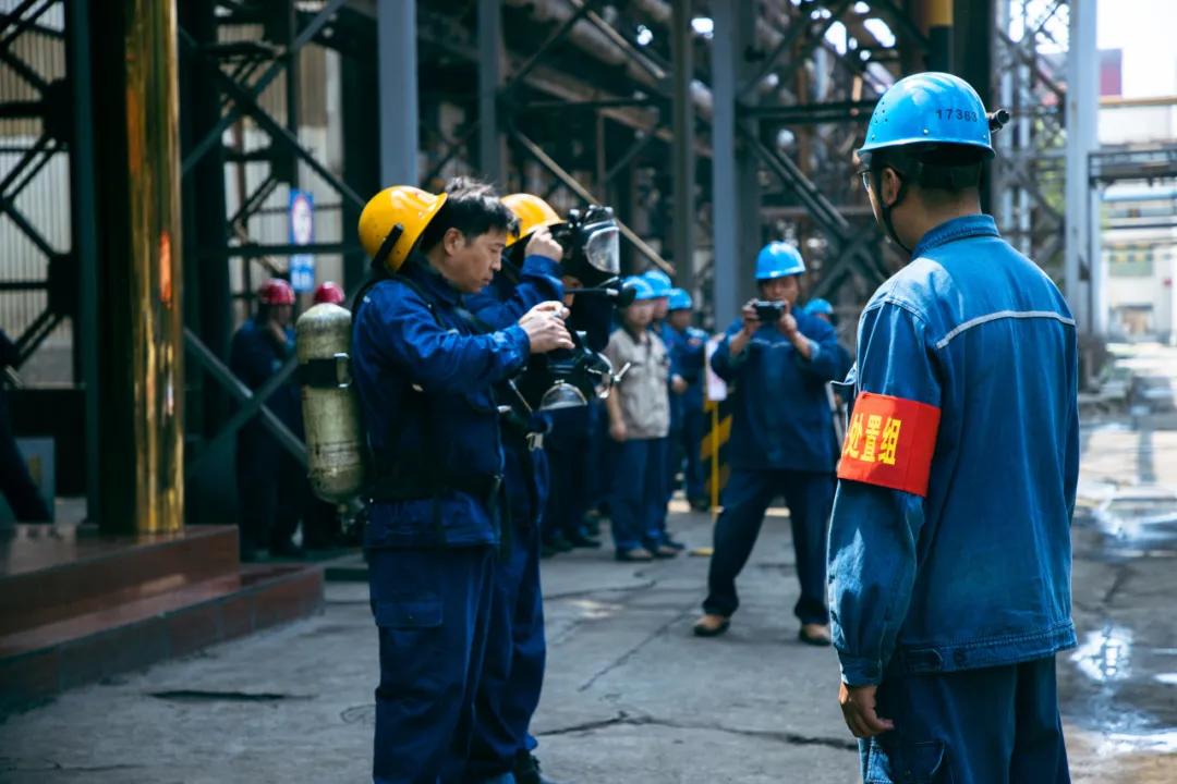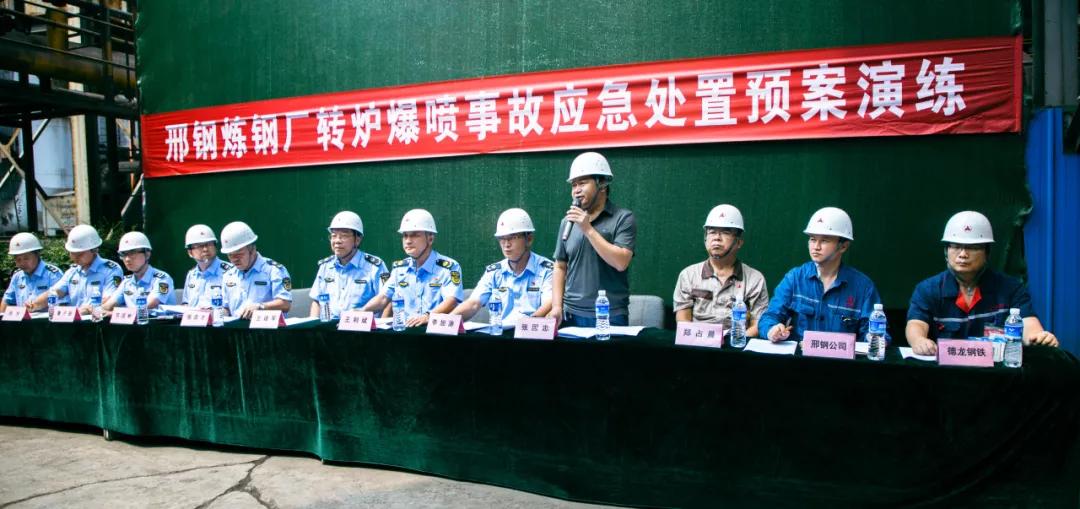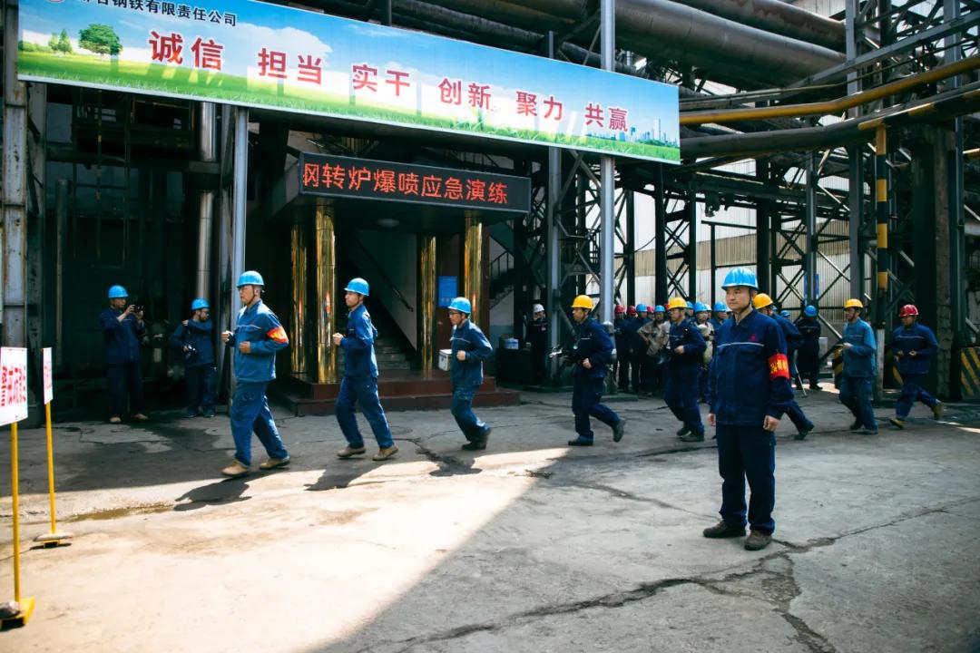 隨后,參會人員一起現(xiàn)場觀摩了邢鋼高溫熔融金屬爆噴事故現(xiàn)場應急處置演練。本次演練,模擬煉鋼廠加料跨天車向2#轉爐加廢鋼時發(fā)生爆噴為背景,演示了事故上報、安全疏散、預案啟動、現(xiàn)場搶險、應急救援等環(huán)節(jié)。