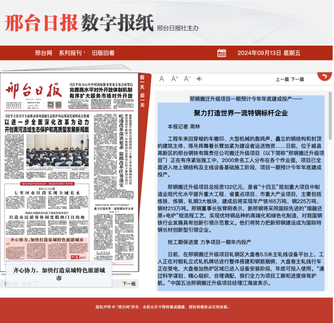 邢鋼搬遷升級項目總投資132億元,是省“十四五”規(guī)劃重大項目中制造業(yè)現(xiàn)代化水平提升重大工程、省重點項目、市重大產(chǎn)業(yè)項目,主要包括煉鐵、煉鋼、軋鋼3大板塊,建成后將實現(xiàn)年產(chǎn)鐵165萬噸、鋼225萬噸、鋼材213萬噸。邢鋼董事長張育明表示,新邢鋼將采用國際先進(jìn)的“熔融還原+電爐”短流程工藝,實現(xiàn)優(yōu)特鋼品種的高端化和綠色化制造,對我國鋼鐵行業(yè)發(fā)展具有創(chuàng)新引領(lǐng)示范意義。他們將努力把新邢鋼建設(shè)成為國際特鋼長材創(chuàng)新型引領(lǐng)企業(yè)。