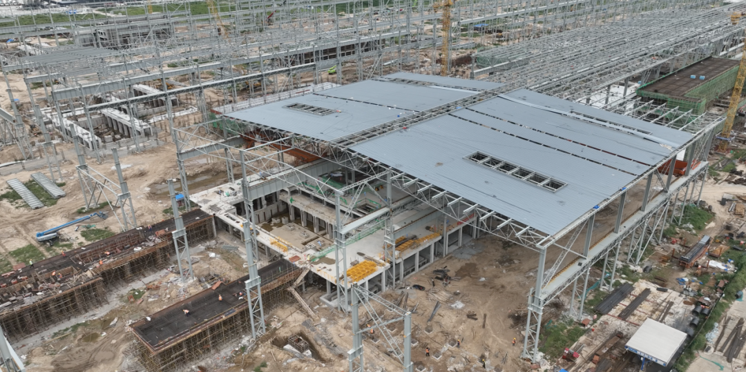 走在項目現(xiàn)場,隨處可見矗立的鋼結(jié)構(gòu)和封頂?shù)慕ㄖ黧w。項目主要部分從西向東分別是煉鐵區(qū)域、煉鋼區(qū)域和軋鋼區(qū)域,項目鋼結(jié)構(gòu)工程已全面鋪開。